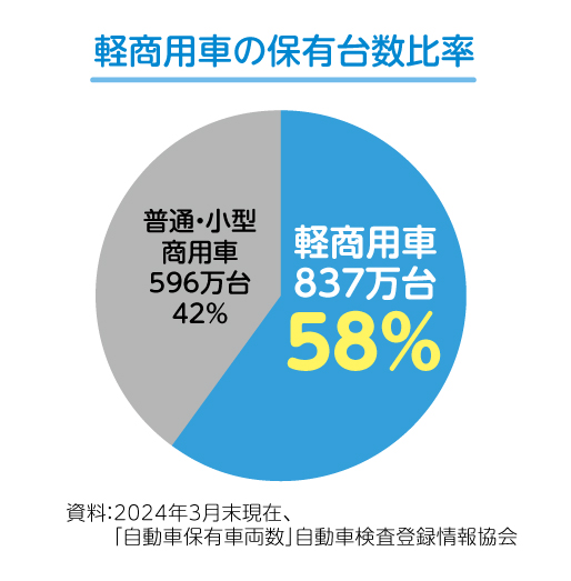 軽自動車の保有台数は、3,000万台以上。これは、自動車の総保有台数の約4割近くを占めることになります。毎日の暮らしや仕事はもちろん、より良い環境づくりやクルマ社会の未来に向けて。軽自動車は、かけがえのない存在として貢献していきます。